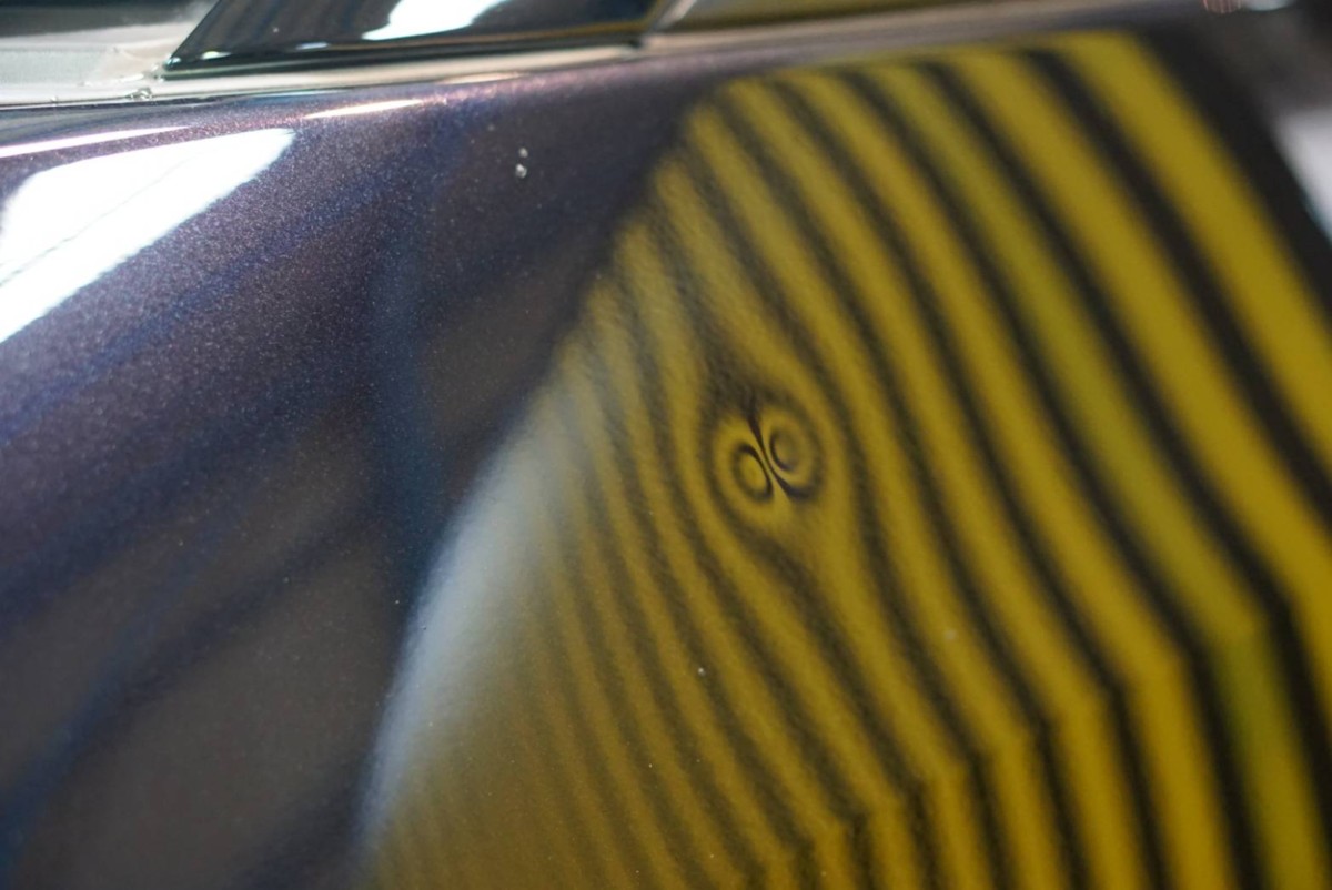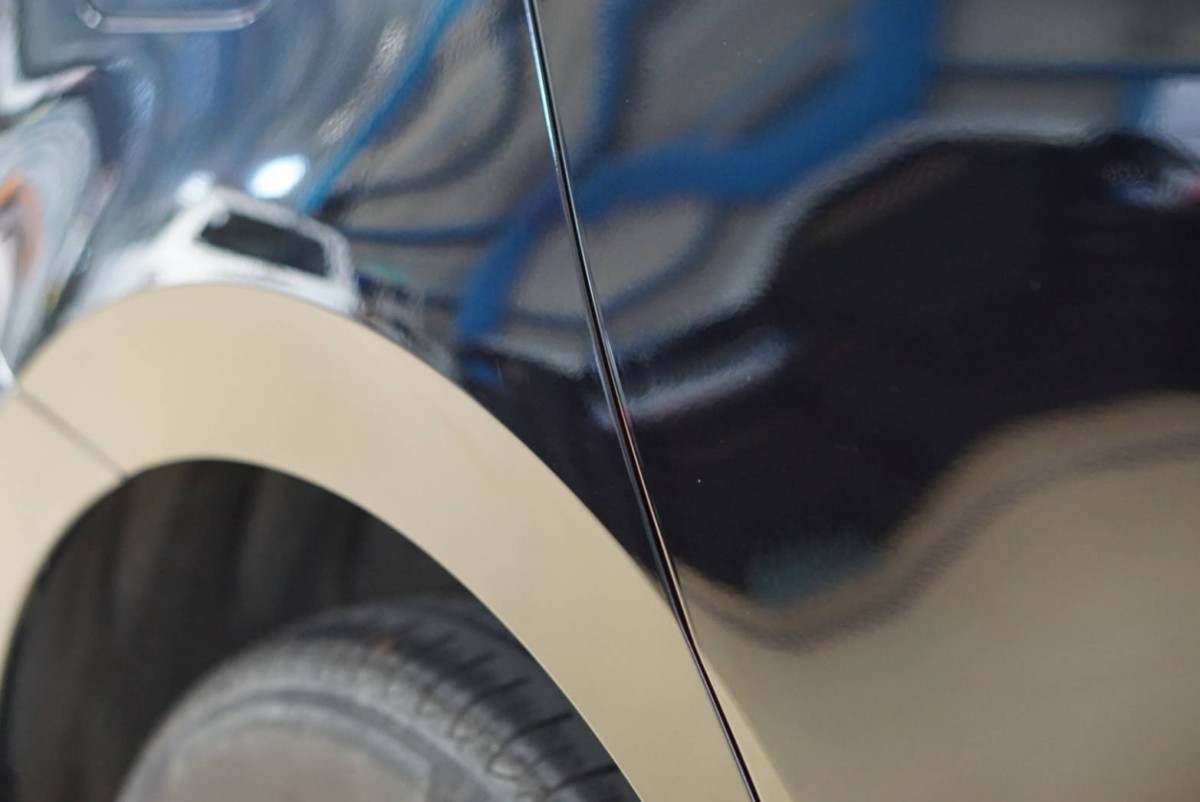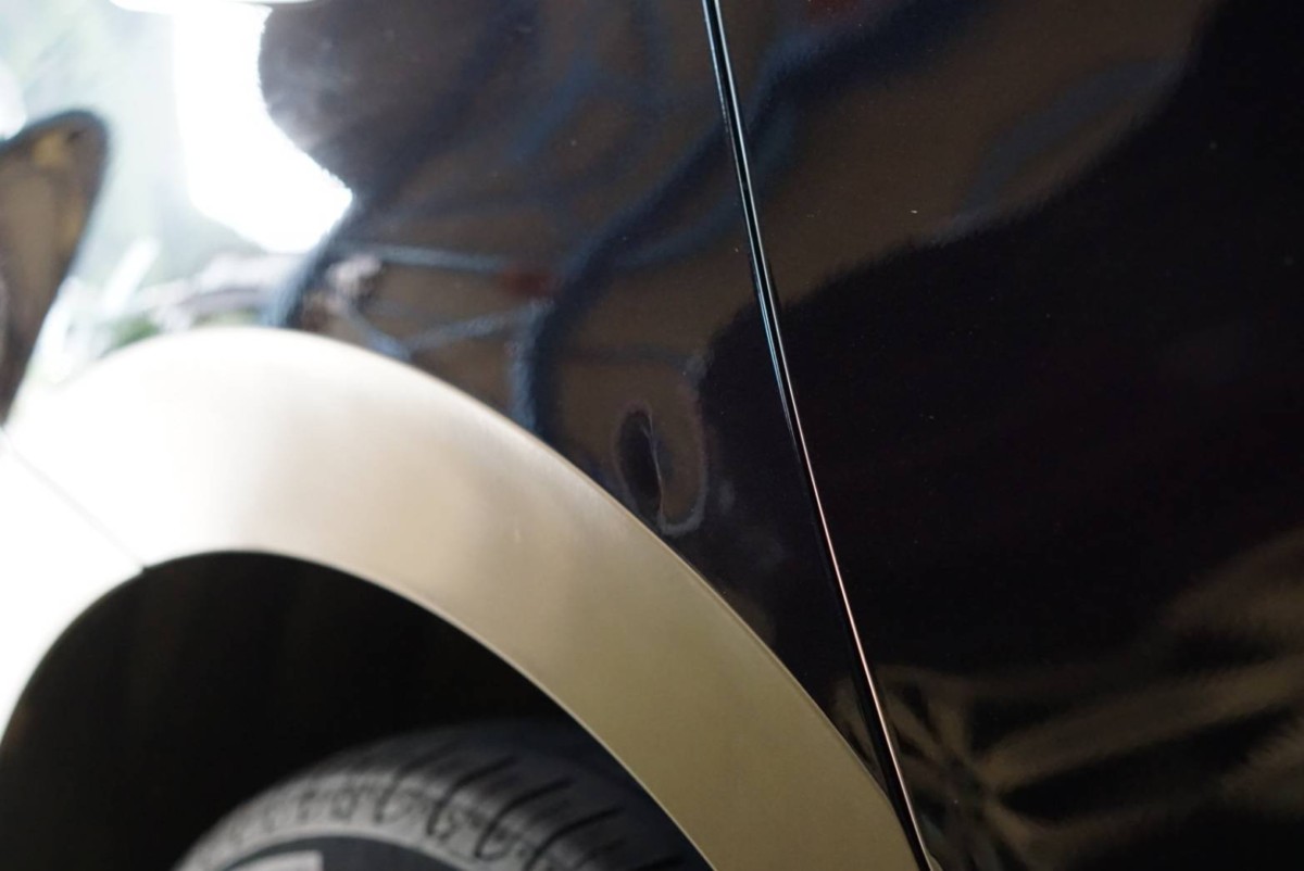 右側クォーターパネルにドアパンチを受けたと思われるヘコミです。