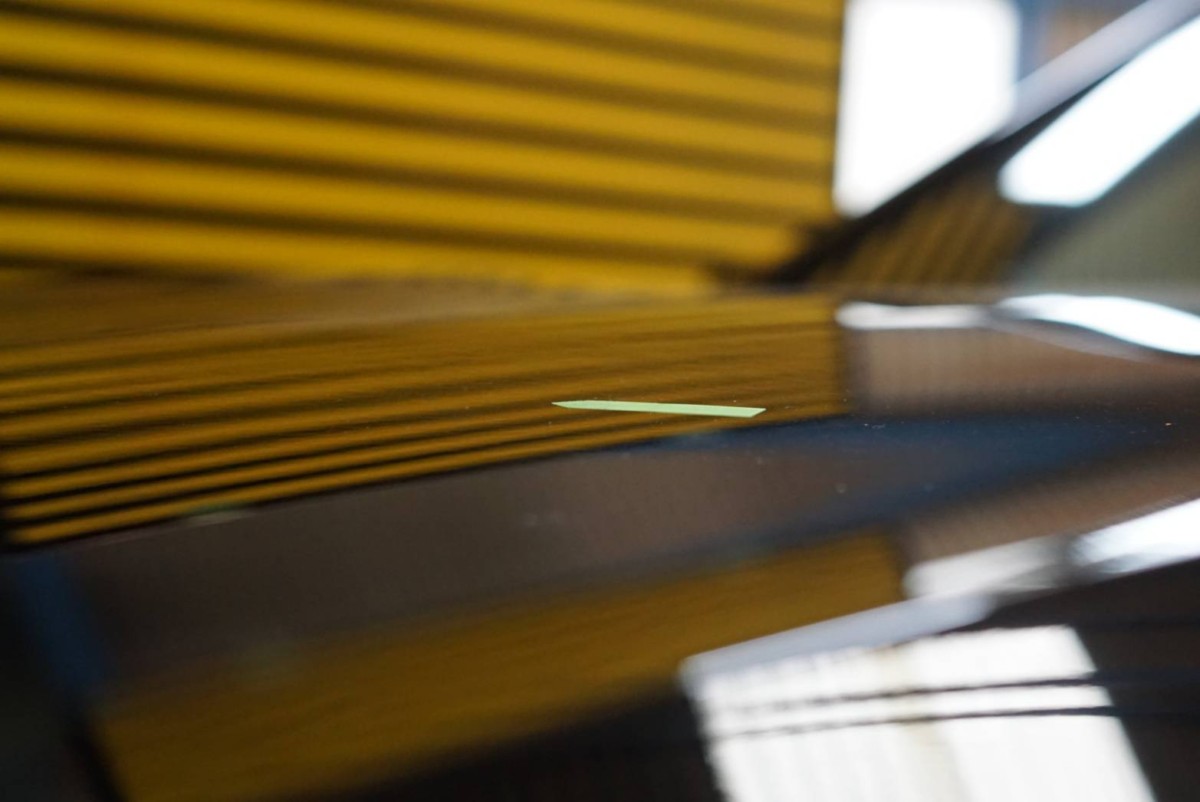 少しのヘコミでもラインボードを映し込んでみると、違和感のある場所はラインが歪みます。