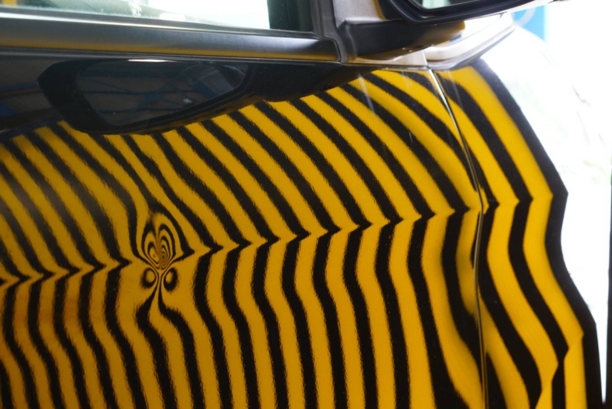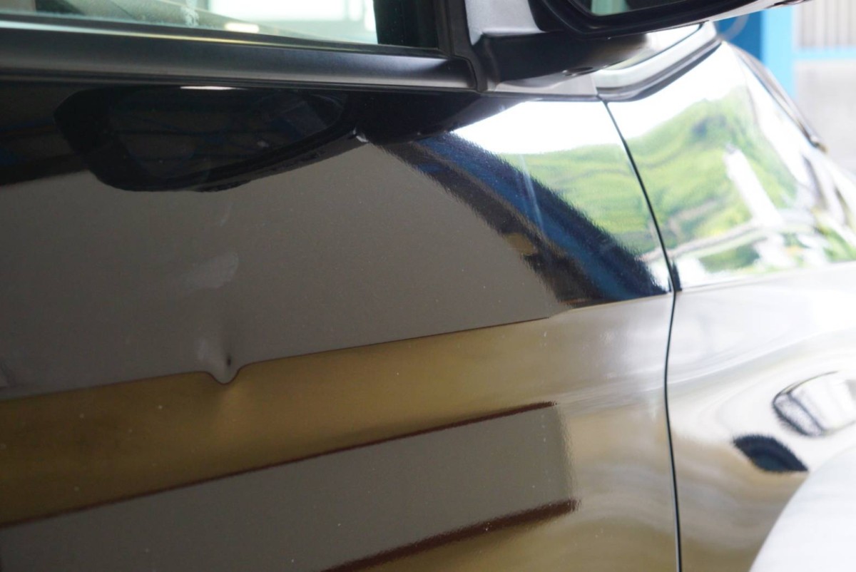 運転席のドア、プレスライン部にドアパンチと思われるヘコミです。