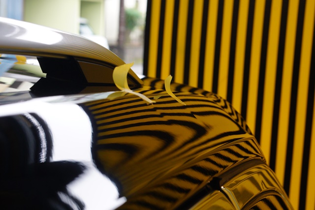 ラインボードによる左フェンダーのヘコミの確認です。